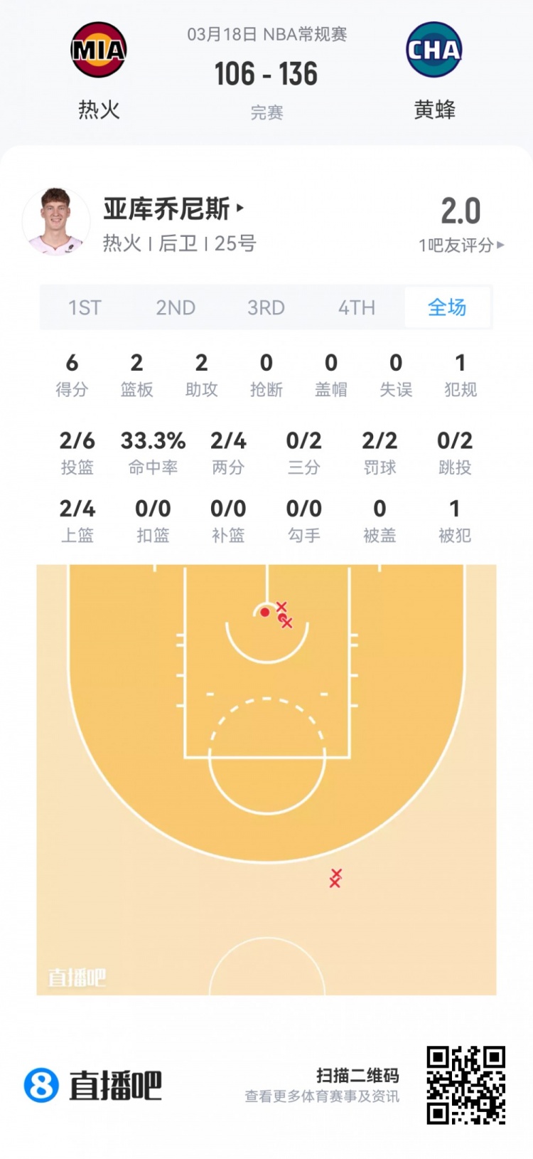 熱火首輪20號(hào)秀亞庫(kù)喬尼斯 登場(chǎng)14.9分鐘
