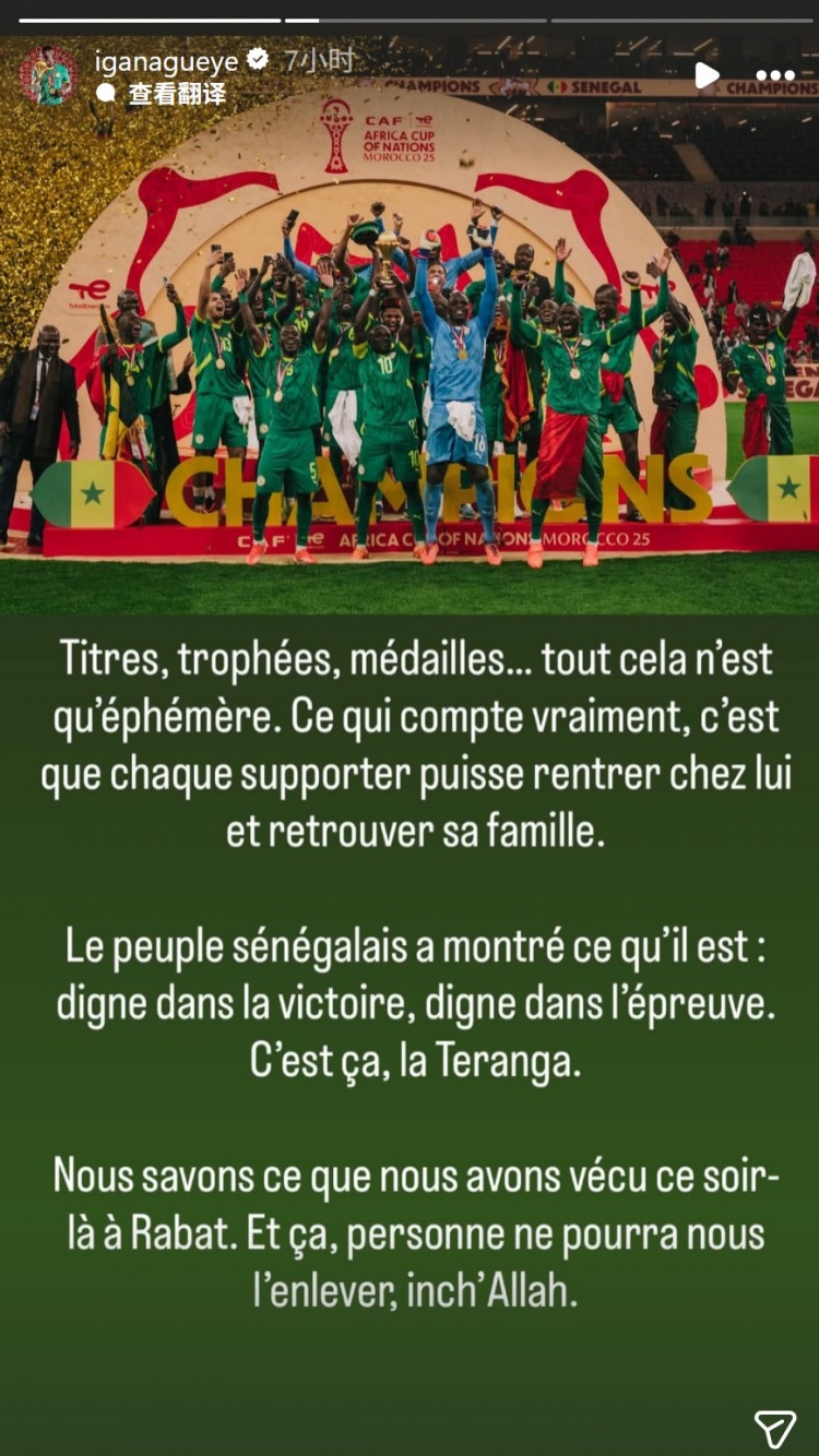 蓋耶社媒談塞內(nèi)加爾被剝奪冠軍:沒人能奪走我們奪冠的回憶