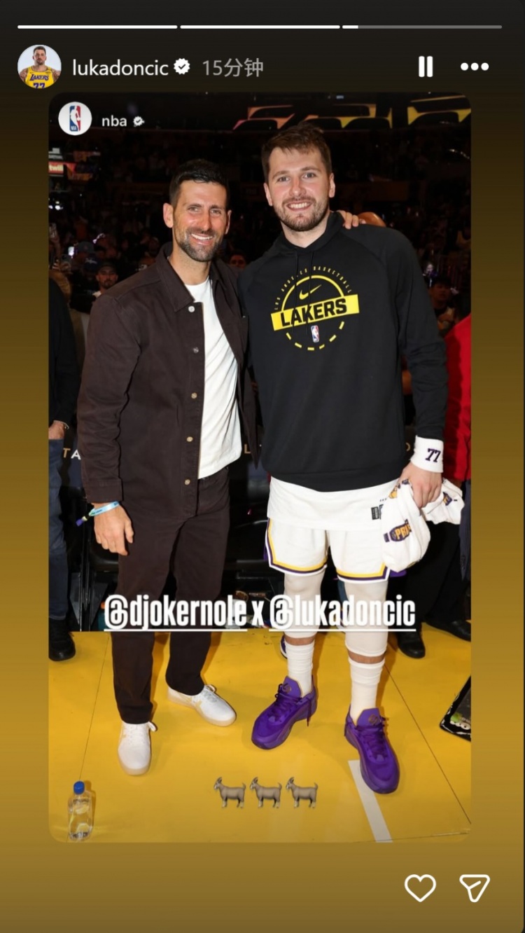 本場網(wǎng)壇巨星德約科維奇現(xiàn)場觀戰(zhàn)并與東契奇合影,NBA官方曬出了兩人合影。賽后東契奇在INS上轉(zhuǎn)發(fā)并寫道:“