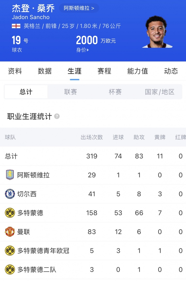 桑喬現(xiàn)年25歲,他本賽季被租借至維拉,賽季29場1球1助。他的周薪20萬鎊,與曼聯(lián)的合同今夏到期,現(xiàn)身價2000萬歐。在效力多特期間,桑喬一共出場158次,貢獻53球66助。