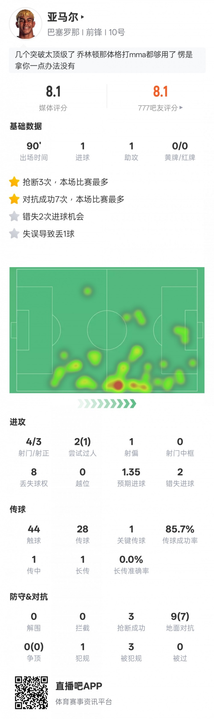 亞馬爾本場數(shù)據(jù):傳射建功+1過人成功+2錯(cuò)失進(jìn)球機(jī)會,評分8.1