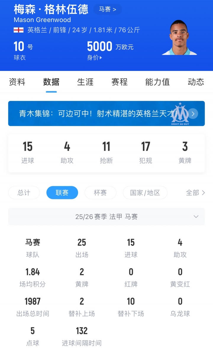 2025-2026賽季,格林伍德在馬賽的表現(xiàn)極為亮眼,躋身歐洲足壇效率最高的前鋒行列。目前他以25場聯(lián)賽15球的成績領跑法甲射手榜,出色的發(fā)揮也吸引了全歐洲球隊的廣泛關注。