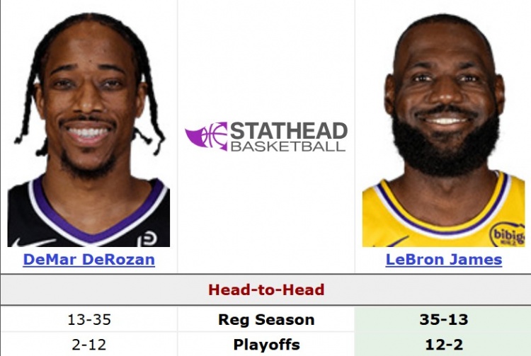 生涯至今,德羅贊常規(guī)賽面對(duì)詹姆斯13勝36負(fù)(勝率26.5%),季后賽2勝12負(fù)(14.2%)。