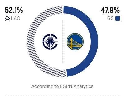 ESPN預(yù)測兩隊(duì)本場勝率:勇士47.9%,快船52.1%。