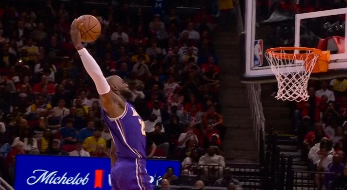 直播吧3月19日訊 湖人客場再戰(zhàn)火箭,截至發(fā)稿詹姆斯已經(jīng)上演3次炸裂扣籃。