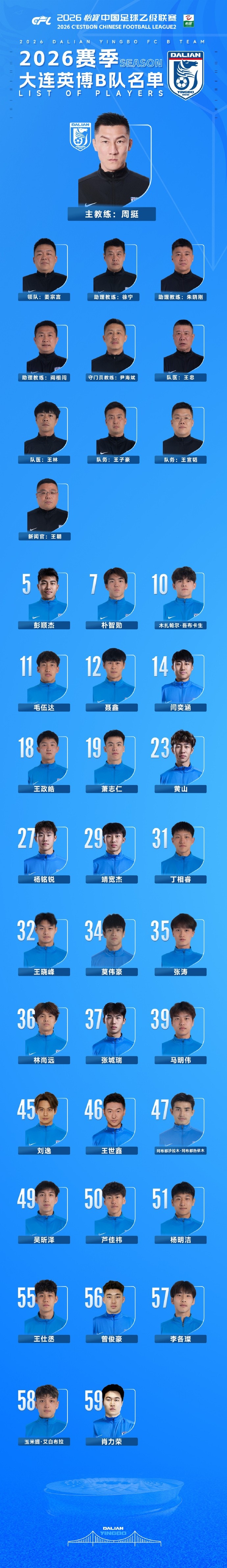 大連英博B隊(duì)名單:黃山、楊銘銳在列,周挺主教練閻相闖助教
