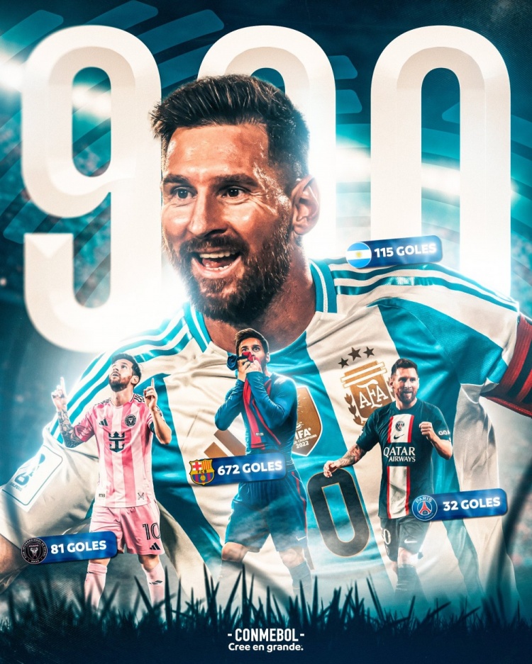 直播吧3月19日訊 中北美洲及加勒比海冠軍杯1/8決賽次回合,邁阿密國際對陣納什維爾。38歲梅西第7分鐘破門,達成生涯900球里程碑!南美足聯(lián)第一時間更新社媒曬出海報祝賀梅西達成900球。