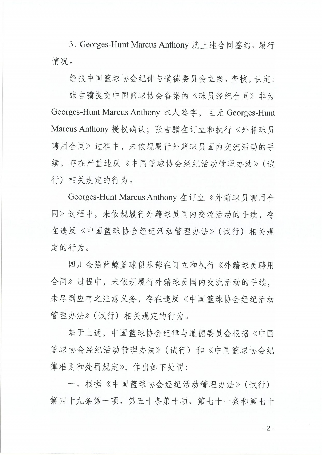 在簽訂和執(zhí)行《外籍球員聘用合同》時,張吉驥、馬庫斯·喬治-亨特以及四川金強(qiáng)藍(lán)鯨俱樂部,都未依規(guī)辦理外籍球員國內(nèi)交流活動的完整手續(xù),違反了《中國籃球協(xié)會經(jīng)紀(jì)活動管理辦法》。