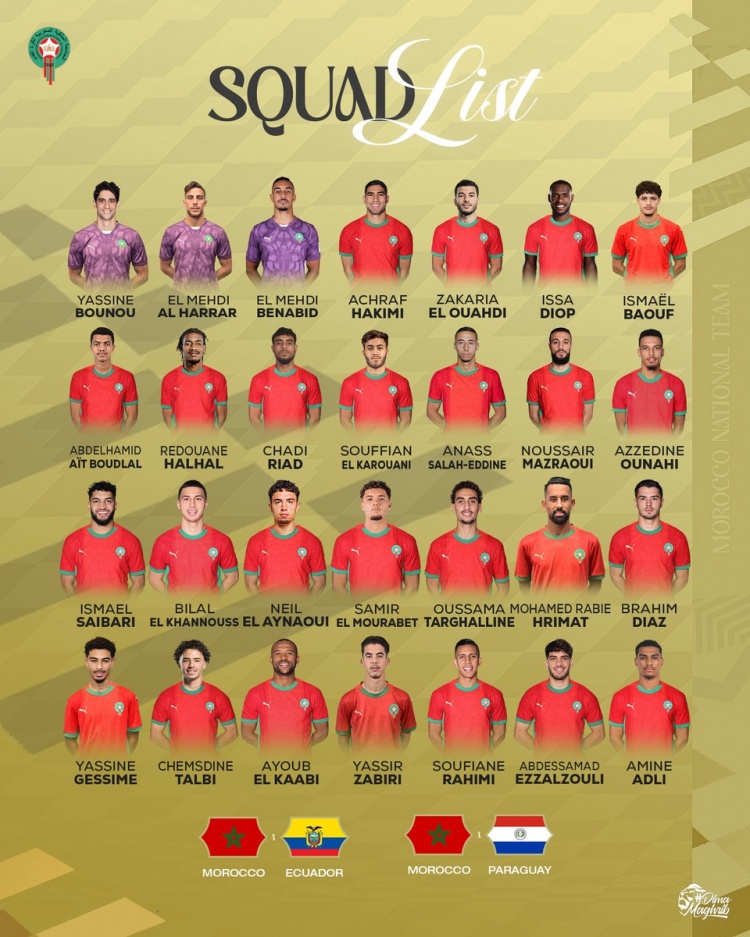 直播吧3月19日訊 摩洛哥國家隊公布新一期名單,摩洛哥將在下個國際比賽日的友誼賽中對陣厄瓜多爾、巴拉圭。