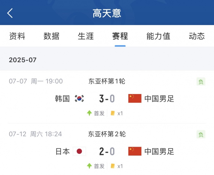 高天意現(xiàn)年27歲,他此前一共為中國男足出場8次,包括4場世預(yù)賽、2場友誼賽以及2場東亞杯。他上次為國足出戰(zhàn)是在2025年7月的東亞杯,在0-3不敵韓國和0-2不敵日本的比賽中,高天意均首發(fā)打滿全場。