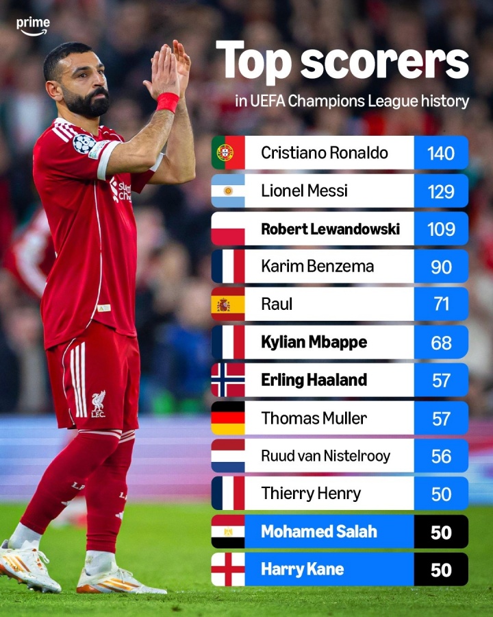 直播吧03月19日訊 本賽季歐冠1/8決賽全部結(jié)束,外媒統(tǒng)計(jì)了歐冠歷史射手榜,C羅140球位居榜首,梅西、萊萬分列二三。薩拉赫、凱恩均達(dá)成各自的歐冠生涯50球,躋身榜單前十。