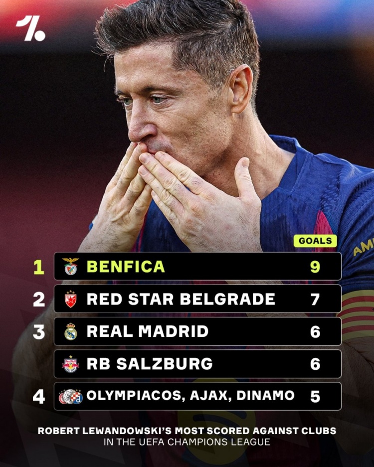 直播吧3月19日訊 今日,足球媒體OneFootball列出了被萊萬多夫斯基在歐冠賽場(chǎng)上進(jìn)球最多的俱樂部,其中面對(duì)本菲卡他的進(jìn)球數(shù)最多,共9次轟開對(duì)方大門。