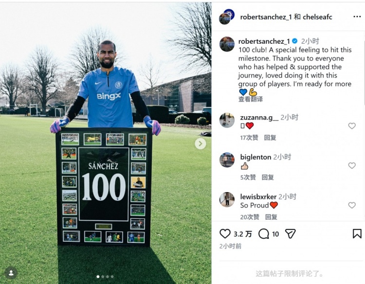直播吧3月20日訊 切爾西門將桑切斯更新社媒動態(tài),慶祝達(dá)成藍(lán)軍生涯100場比賽里程碑。
