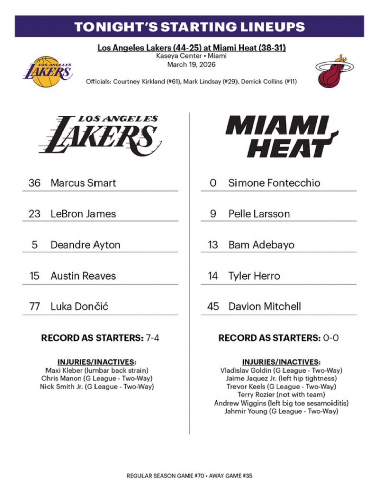 直播吧3月20日訊 今日NBA常規(guī)賽,湖人背靠背挑戰(zhàn)熱火,賽前雙方公布了本場比賽首發(fā)陣容。