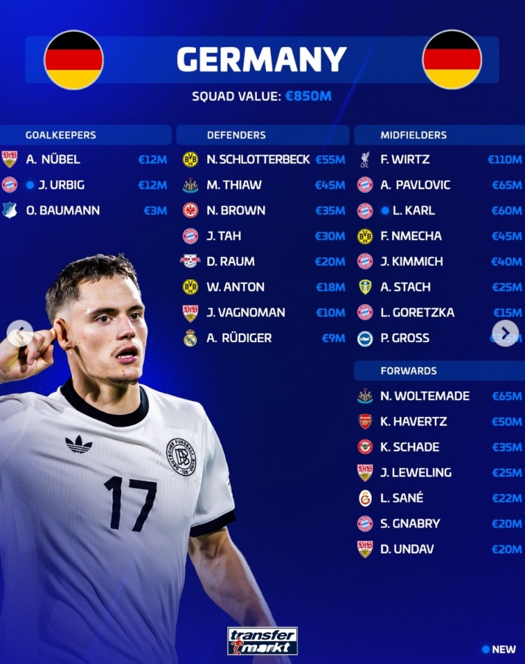 直播吧3月20日訊 近日,德轉網站更新了新一期德國國家隊球員身價,其中維爾茨以1.1億歐身價高居首位,沃爾特馬德、帕夫洛維奇以6500萬歐位居次席。