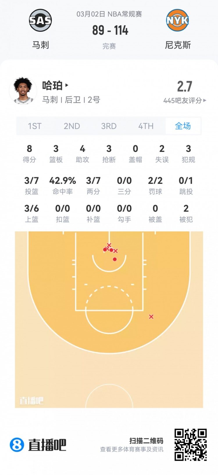 馬刺榜眼秀哈珀 登場22.1分鐘