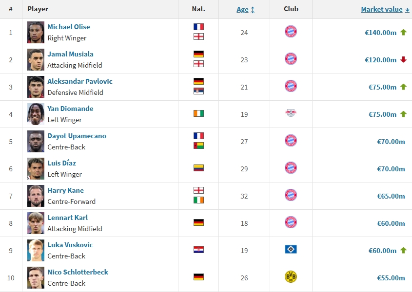 直播吧03月20日訊 今日德轉(zhuǎn)更新了德甲球員身價,拜仁前鋒奧利塞身價漲至1.4億歐元,上漲1000萬歐元;穆西亞拉身價下跌1000萬歐,跌至1.2億歐元;迪奧曼德身價暴漲3000萬歐,與帕夫洛維奇一起以7500萬歐元的身價并列德甲第三。
