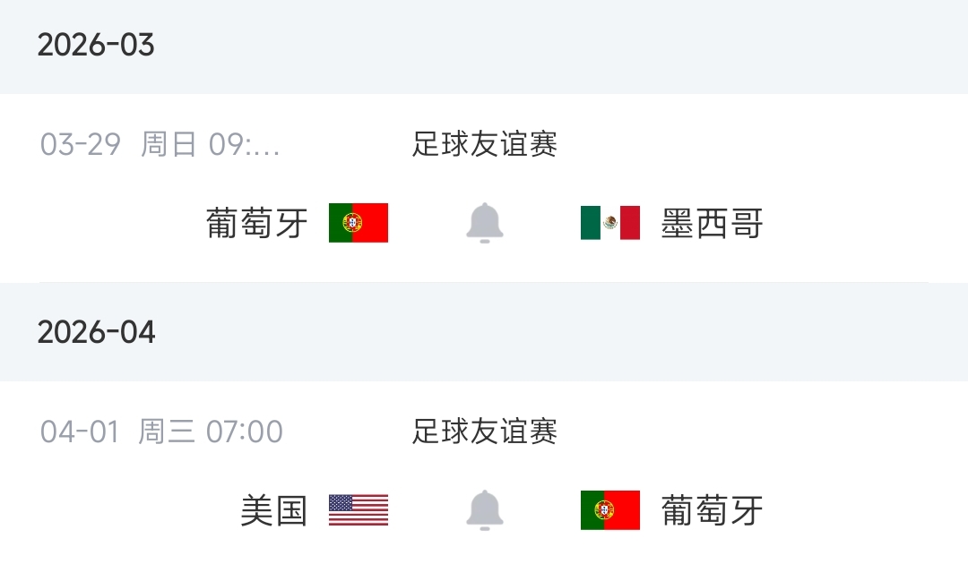 葡萄牙本月底將前往墨西哥和美國(guó)進(jìn)行兩場(chǎng)熱身賽,分別是北京時(shí)間3月29日上午9點(diǎn)對(duì)陣墨西哥、4月1日上午7點(diǎn)對(duì)陣美國(guó)。
