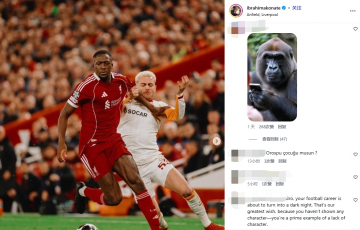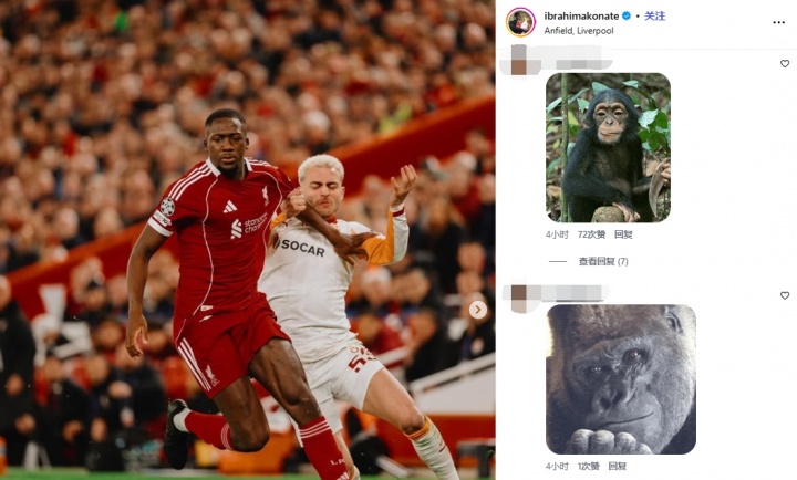 評論中更多是對科納特直接的人身攻擊,有部分球迷還發(fā)出了種族歧視意味濃重的黑猩猩圖片。