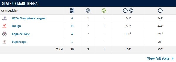 本賽季貝爾納爾復(fù)出之后,已經(jīng)為巴薩在各項賽事中出戰(zhàn)26場,一共踢了970分鐘。弗里克最初對他的使用非常耐心,直到德容受傷后,才讓貝爾納爾重新成為先發(fā),出任球隊后腰。