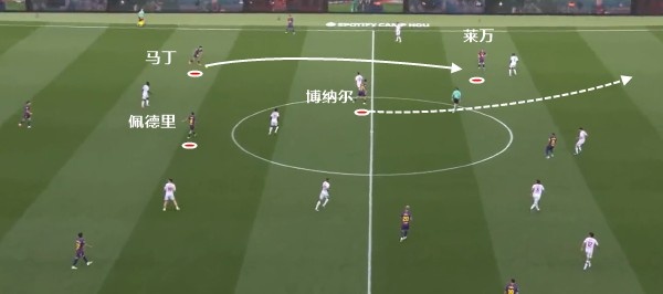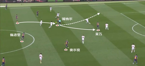 雖然之后皮球沒有給到貝爾納爾這一側(cè),不過通過佩德里的傳球找到了中路奧爾莫的機會。