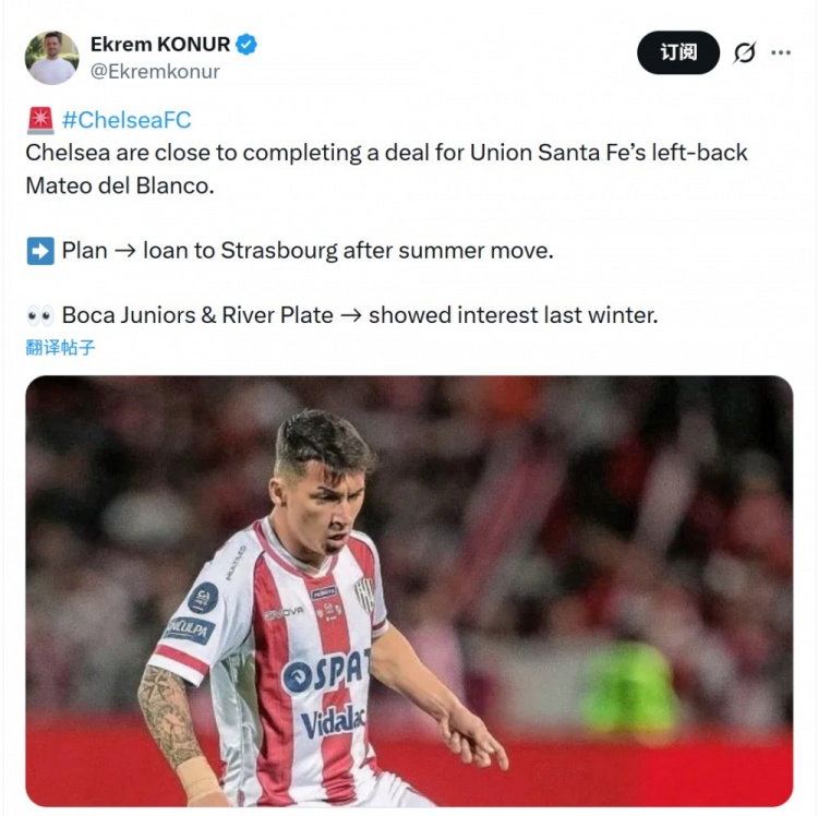 Ekrem KONUR透露,切爾西接近完成引進(jìn)圣菲聯(lián)合邊衛(wèi)德爾-布蘭科的交易,藍(lán)軍計(jì)劃今夏球員正式轉(zhuǎn)會(huì)后將其外租至斯特拉斯堡,博卡和河床去年冬天曾對(duì)德爾-布蘭科表示出興趣。
