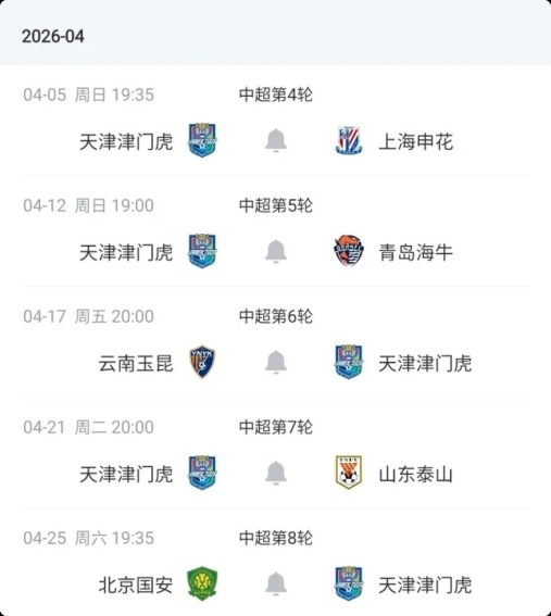 接下來5輪比賽,津門虎第4輪回到主場迎戰(zhàn)上海申花,第5輪依舊坐鎮(zhèn)主場對陣青島海牛,第6輪客場挑戰(zhàn)云南玉昆,隨后兩輪比賽將主場對陣山東泰山以及客場挑戰(zhàn)北京國安。