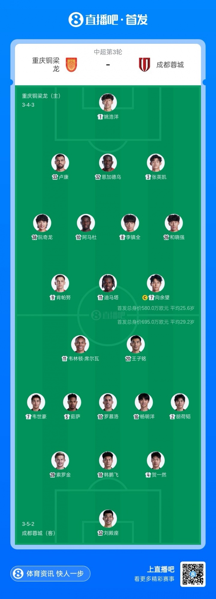 直播吧03月21日訊 北京時間19:35,中超第3輪,重慶銅梁龍主場對陣成都蓉城。賽前,雙方首發(fā)出爐。