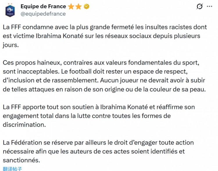 法國足協(xié)官方譴責(zé)歧視科納特的行為:“法國足協(xié)對科納特近日在社交媒體上遭受的種族主義侮辱表示最嚴(yán)厲的譴責(zé)。這些充滿仇恨的言論違背了體育的基本價值觀,是絕對不可接受的。足球必須始終是一個充滿尊重、包容與團結(jié)的領(lǐng)域,任何球員都不應(yīng)因其出身或膚色而遭受此類攻擊。