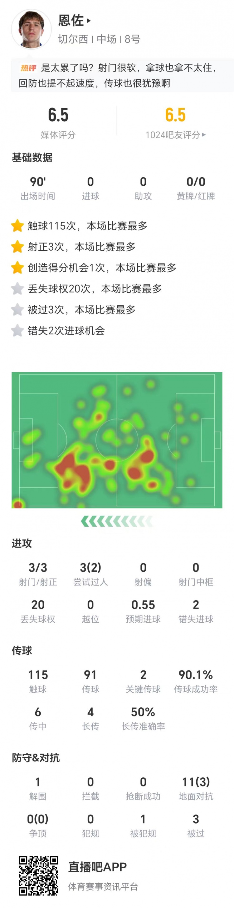 賽后技術(shù)統(tǒng)計(jì)數(shù)據(jù)顯示,恩佐本場比賽3射3正,3次過人兩次成功,20次丟失球權(quán),兩次錯(cuò)失進(jìn)球,兩次關(guān)鍵傳球,11次地面對抗僅成功3次,獲評6.5分。