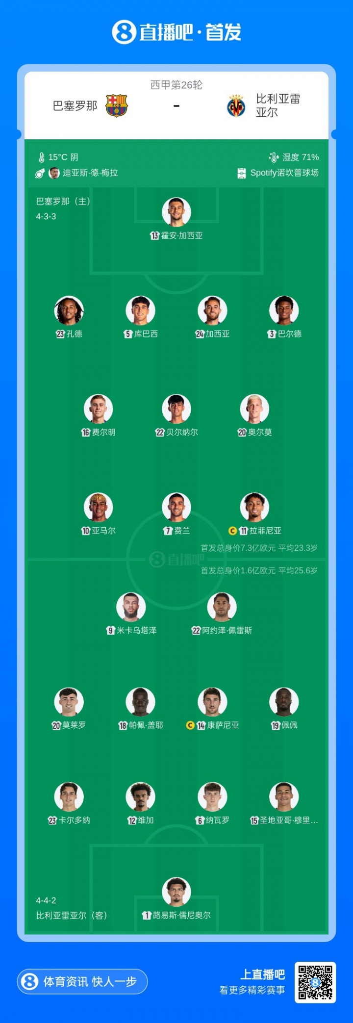 直播吧02月28日訊 北京時(shí)間23:15,西甲第26輪,巴薩對(duì)陣比利亞雷亞爾。賽前,雙方首發(fā)出爐?!景退_方面,德容傷缺,佩德里替補(bǔ)待命,亞馬爾、拉菲尼亞、費(fèi)蘭先發(fā),奧爾莫、費(fèi)爾明出戰(zhàn);比利亞雷亞爾方面,佩佩、蓋耶、米卡烏塔澤先發(fā),帕雷霍、托馬斯替補(bǔ)】