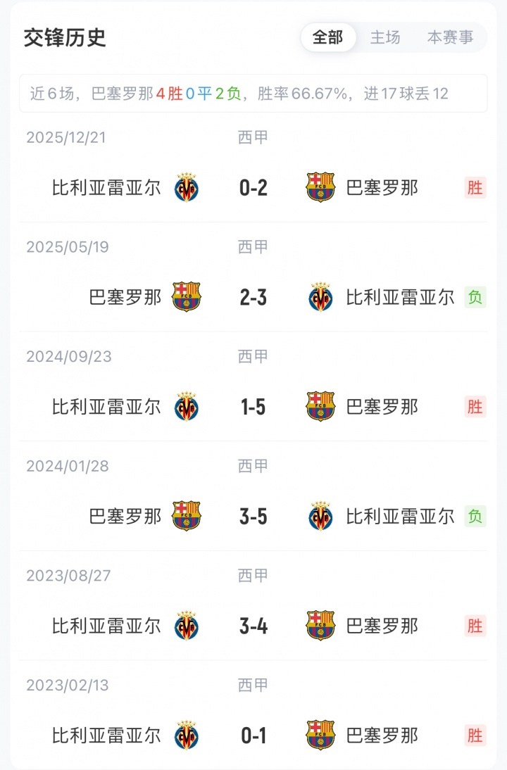 目前,巴薩20勝1平4負(fù)積61分位列西甲榜首,領(lǐng)先皇馬1分;比利亞雷亞爾16勝3平6負(fù)積51分,位列西甲第3。