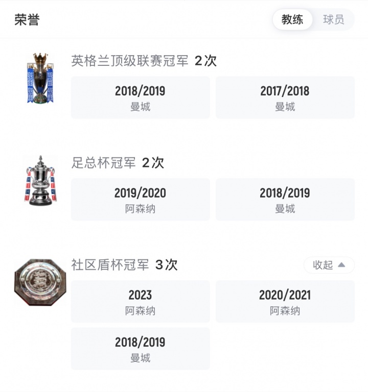 阿爾特塔教練生涯榮譽(yù),包含曼城助教時(shí)期以及阿森納主帥時(shí)期