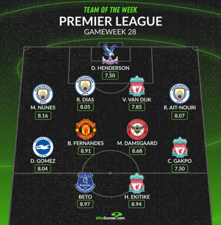 中場:戈麥斯(布萊頓)、B費(曼聯(lián))、達姆斯高(布倫特福德)、加克波(利物浦)