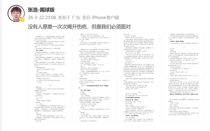 直播吧03月22日訊 被中國足協(xié)禁足五年的前黑龍江冰城球員張浩更新社媒,轉(zhuǎn)發(fā)了一篇長文,并配文:沒有人愿意一次次揭開傷疤,但是我們必須面對。