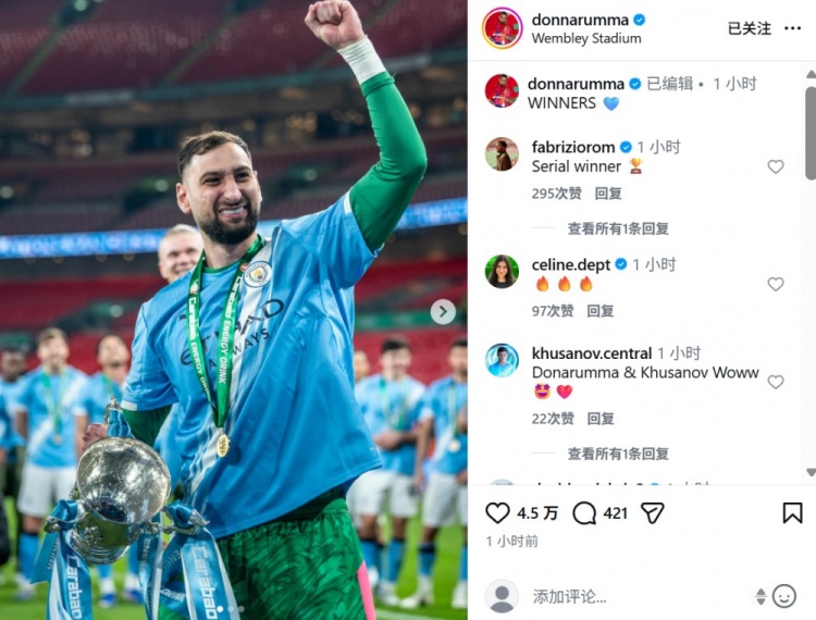 多納魯馬也收獲個人曼城生涯首個冠軍,賽后他也在社媒曬出自己與冠軍獎杯慶祝合影,配文寫道:“冠軍!”