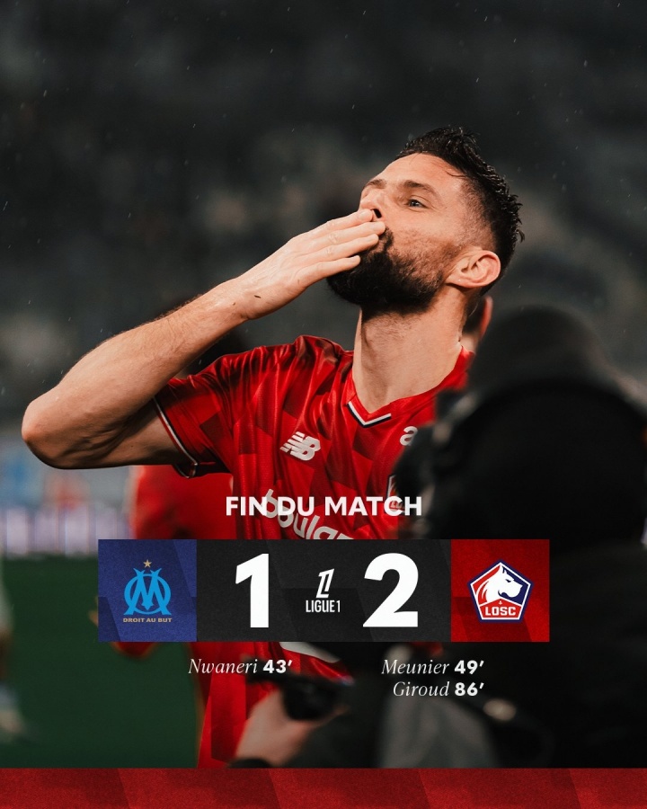 比賽尾聲,又是穆尼耶送出助攻,替補登場的39歲法國老將吉魯頭槌破門,里爾在最后時刻反超比分!