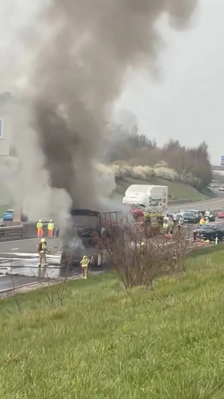 有人在社交媒體上寫道:“一輛載著曼城球迷前往溫布利的大巴,剛過收費(fèi)站在M6高速上起火了,我們完全堵死了,希望大家都沒事?!?/p>
