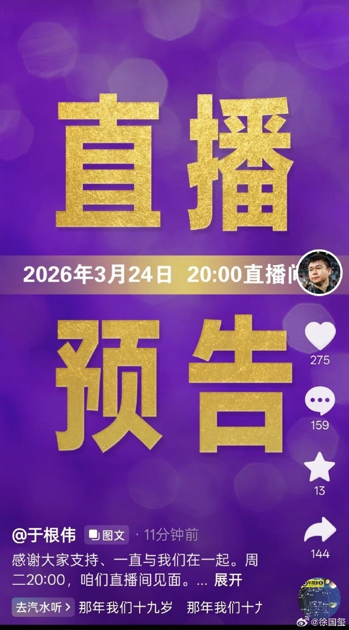 直播吧3月23日訊 津門虎主帥于根偉在個(gè)人社媒透露,明晚20點(diǎn)他將與球迷直播互動(dòng)。