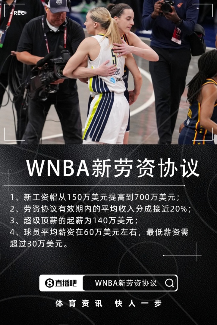 據(jù)此前報道稱,WNBA達(dá)成了一項具有里程碑意義的新勞資協(xié)議,其中工資帽升至700萬,球員平均薪資為60萬,且平均的收入分成接近20%。