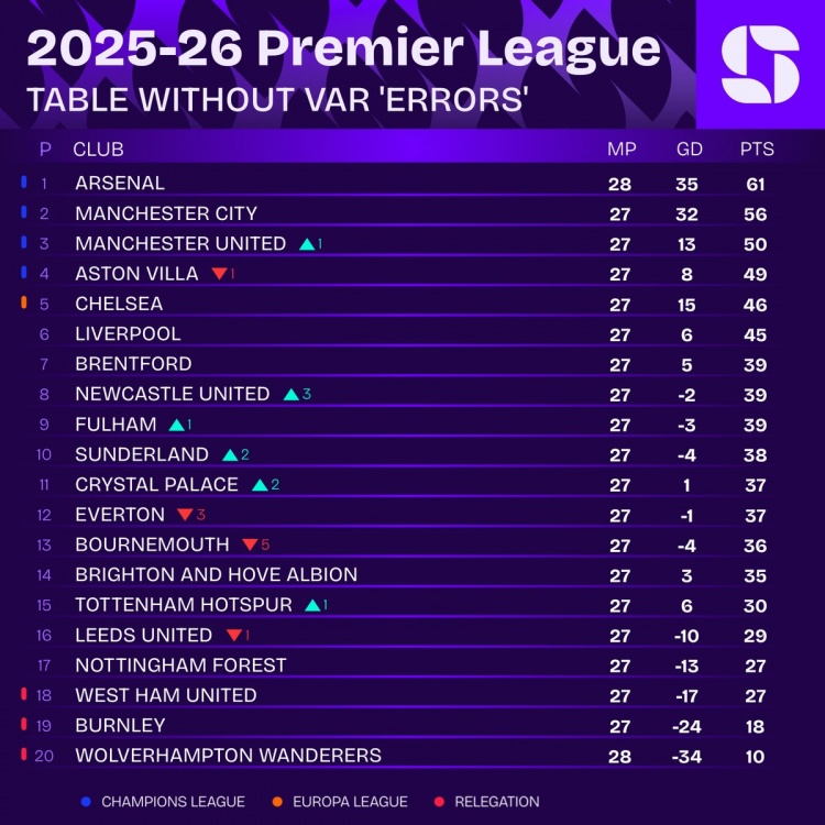 VAR未犯錯(cuò)情況下英超積分榜:阿森納居首,曼城、曼聯(lián)二三位