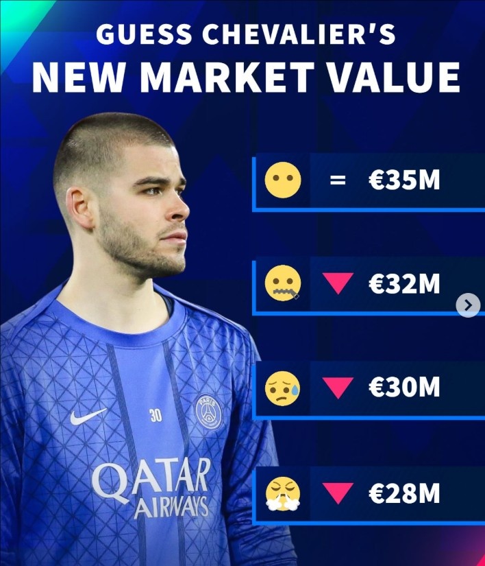 直播吧3月25日訊 德國轉(zhuǎn)會市場曬照,預(yù)熱巴黎門將舍瓦利耶的身價,四種方案的三種都是身價下調(diào)。