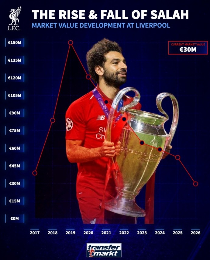 德轉列薩拉赫紅軍生涯身價變化:最高1.5億歐,如今只有3000萬歐