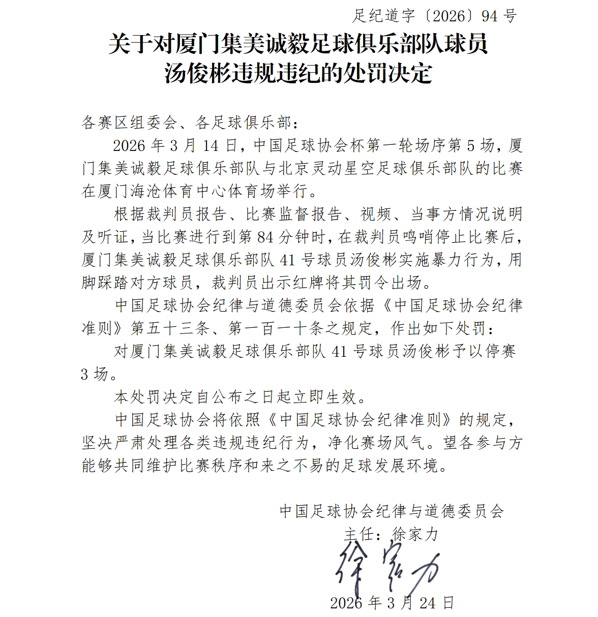 對廈門集美誠毅足球俱樂部隊41號球員湯俊彬予以停賽3場。