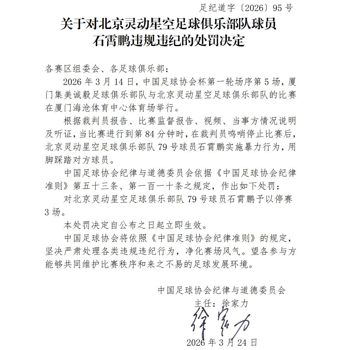 對北京靈動星空足球俱樂部隊79號球員石霄鵬予以停賽3場。