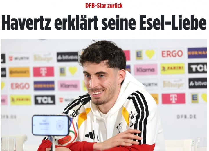 哈弗茨:“是的,我對驢的喜愛一直存在。具體來說,我就是喜歡驢子。我不知道這種感情是怎么產(chǎn)生的。大概在我很小的時候,不知怎么就喜歡上了驢子。隊友們也知道這件事,有些人還會拿這件事開玩笑。對我個人來說,動物保護(hù)一直是非常重要的議題。我非常喜歡動物,家里養(yǎng)了三只狗。我們在德國也有驢子??偟膩碚f,驢子是特別棒的動物。”