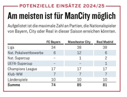 上賽季在極端情況下,曼城球員需要踢85場,皇馬球員要踢81場,拜仁球員要踢74場。不過,由于三支球隊的杯賽(歐冠&世俱杯)行程結(jié)束較早,球員們躲過一劫。