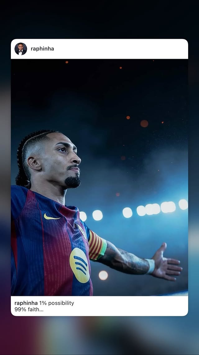 在社交媒體上,巴薩邊鋒拉菲尼亞寫道:1%的機會,99%的信念。有趣的是,巴薩另外一名邊鋒亞馬爾此前發(fā)過同款社媒??雌饋碇鲌鲇瓚?zhàn)馬競的比賽,拉菲尼亞和亞馬爾將會盡全力去沖擊對手防線。