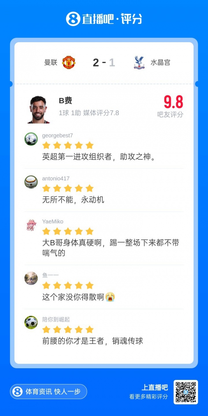 本輪比賽,B費(fèi)貢獻(xiàn)6次關(guān)鍵傳球,傳射建功,幫助曼聯(lián)2-1逆轉(zhuǎn)戰(zhàn)勝水晶宮,升上英超第三,當(dāng)選【直播吧X咪咕體育英超第28輪最佳球員】。