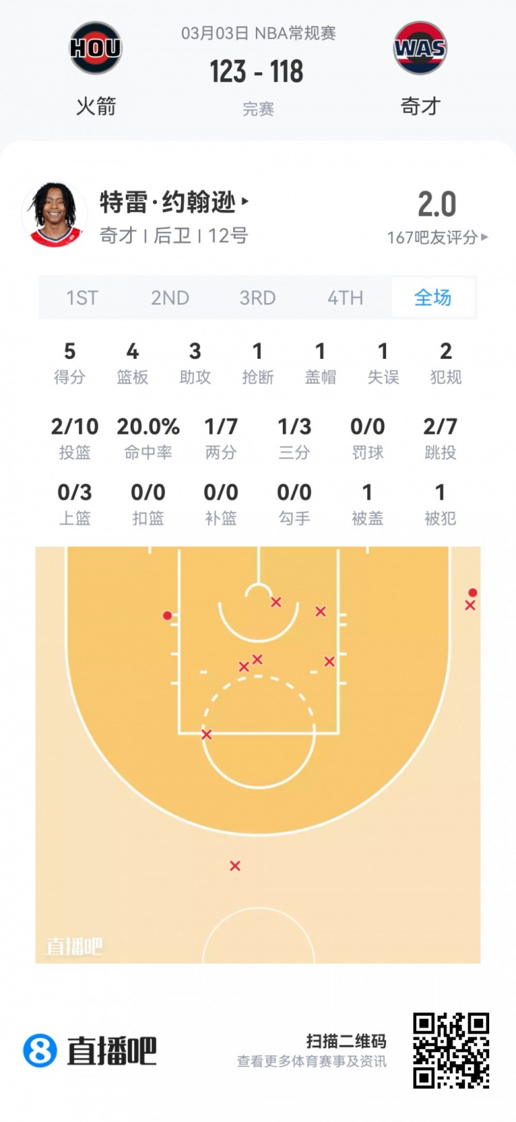 奇才首輪6號(hào)秀特雷·約翰遜 登場(chǎng)21.5分鐘